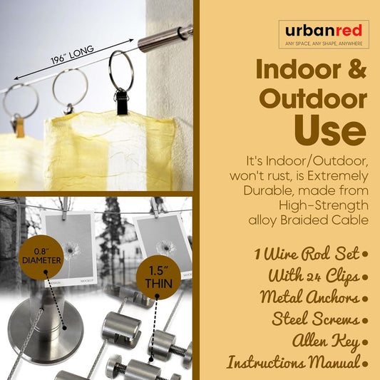 Adjustable Indoor Outdoor Wire Curtain Rod Room Divider Hanging System with 24 Clips Wire Hanging System, For Tapestry, Clothesline Clothes Hanger Kids Craft Art Decoration on Walls